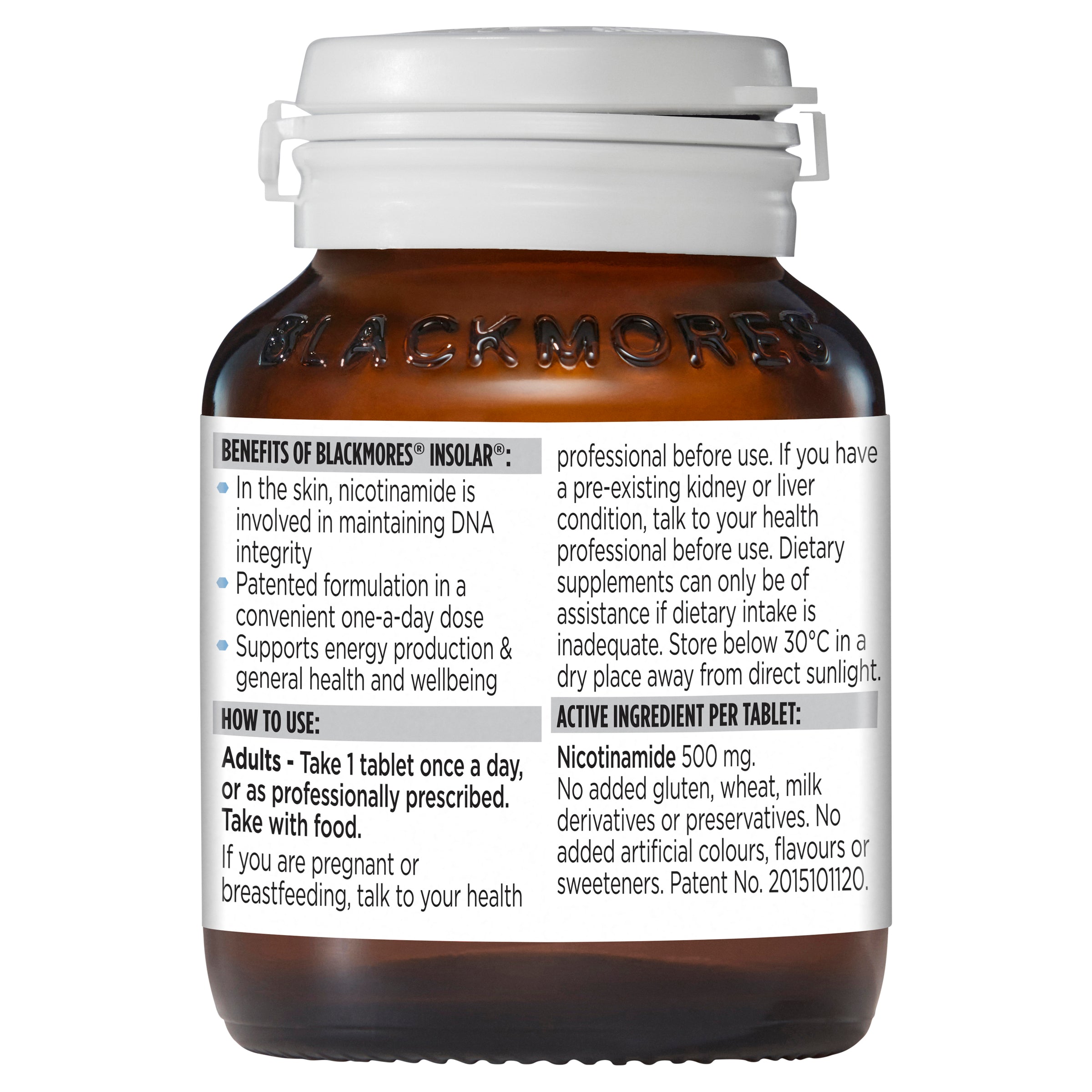 Blackmores Insolar® contains vitamin B3 in the nicotinamide form. Nicotinamide helps support skin health and DNA repair.