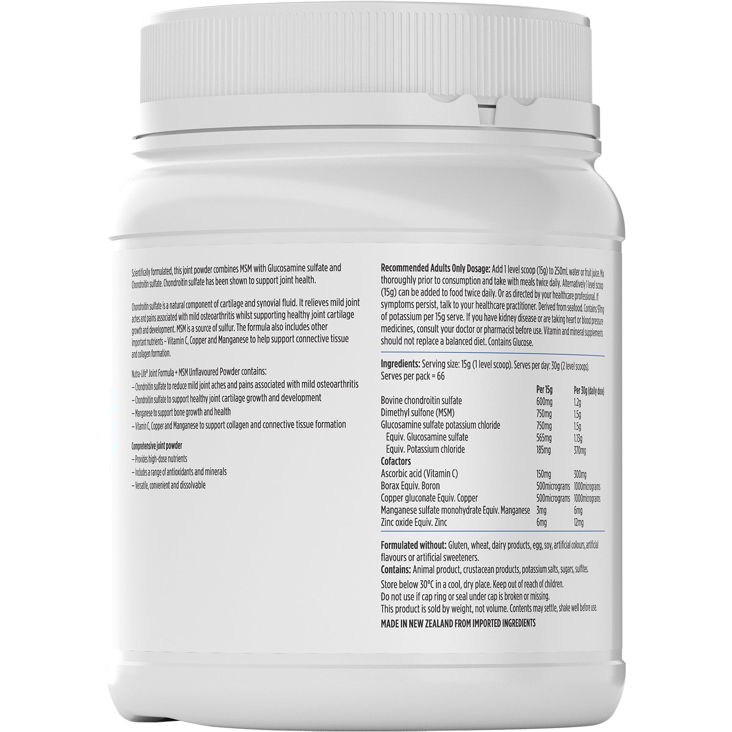 The Chondroitin sulfate in Nutra-Life Joint Formula + MSM Unflavoured powder is a natural component of cartilage and synovial fluid. It relieves mild joint aches and pains associated with mild osteoarthritis whilst supporting healthy joint cartilage growth and development.