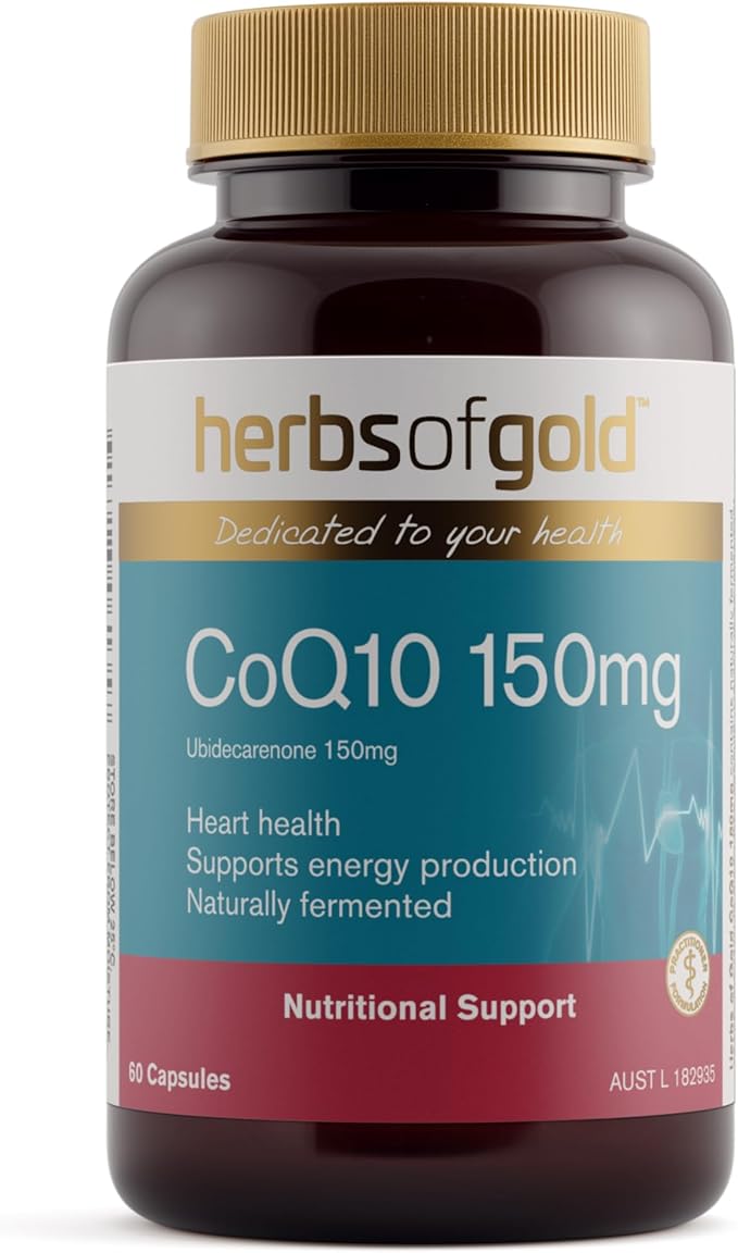 Herbs of Gold CoQ10 150mg contains naturally fermented coenzyme Q10 in a soy-free rice bran oil base. Coenzyme Q10 is a natural substance that is found in all cells of the body. It plays a key role in assisting mitochondria in the production of ATP (energy). Rice bran oil provides a stable, soy-free base making it suitable for those with soy related allergies. Coenzyme Q10 is found in high concentration in the heart muscle, where energy demand is high. It helps maintain a healthy circulatory system, heart function and heart health. Physical exercise increases the body's demand for energy and therefore coenzyme Q10. CoQ10 150mg helps support stamina and endurance during physical exercise and assists post-exercise recovery. Coenzyme Q10 is a potent fat-soluble antioxidant and free radical scavenger that helps prolong the antioxidant activity of vitamin E by regenerating the oxidised form of vitamin E back to its original antioxidant form.