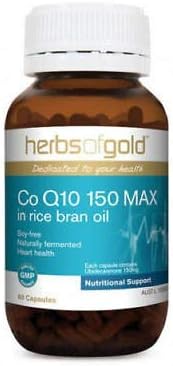Herbs of Gold CoQ10 150mg contains naturally fermented coenzyme Q10 in a soy-free rice bran oil base.