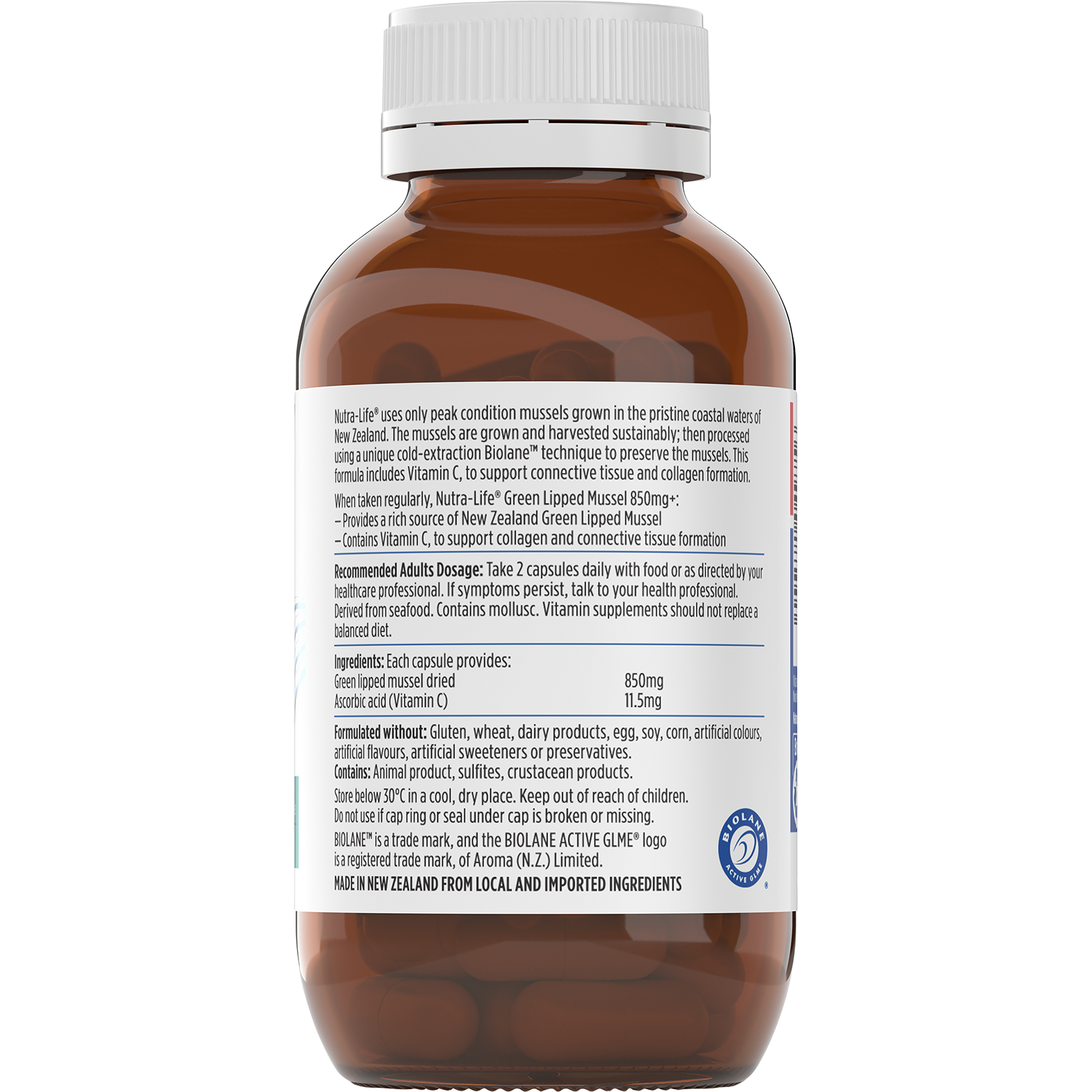 Nutra-Life® uses only peak condition mussels grown in the pristine coastal waters of New Zealand. The mussels are grown and harvested sustainably; then processed using a unique cold-extraction Biolane™ technique to preserve the mussels. This formula includes Vitamin C, to support connective tissue and collagen formation.