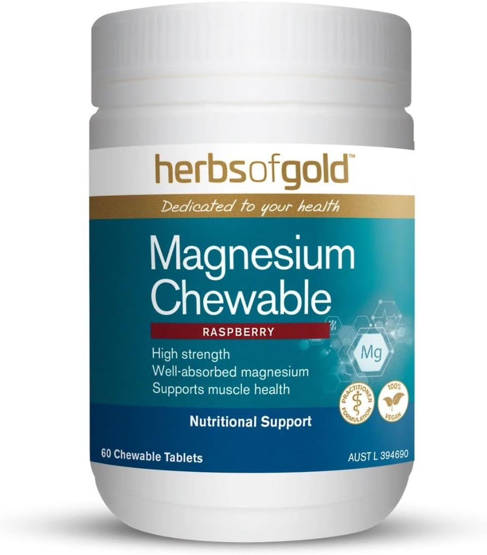 Herbs of Gold Magnesium Chewable is a convenient and great-tasting raspberry flavoured tablet that provides 150mg of elemental magnesium in each serve. Formulated with organic forms of magnesium, this chewable supplement relieves symptoms of premenstrual tension (PMT) and helps reduce menstrual cramps and pain. Magnesium Chewable is designed to support healthy muscle contraction and can relieve muscle cramps when dietary intake is inadequate. It also assists with a healthy stress response, supports nervous system and cardiovascular health, and contributes to strong bones and muscles. Additionally, this formula aids sugar metabolism, helps maintain optimal energy production, and ensures healthy magnesium levels in the body. Herbs of Gold Magnesium Chewable is the ideal choice for anyone seeking easy, everyday magnesium support for overall wellbeing.