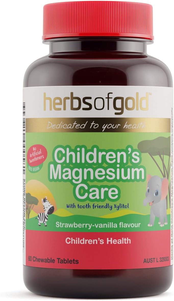 Herbs of Gold Children’s Magnesium Care is a delicious strawberry-vanilla flavoured chewable tablet that contains magnesium to support nervous system health in children. Children’s Magnesium Care has been specifically formulated with a blend of magnesium citrate and amino acid chelate, organic forms of magnesium that are well absorbed in the body. Children’s Magnesium Care supports nervous system function and a healthy stress response in the body. Children’s Magnesium Care assists healthy bone development and maintains bone mineralisation and health in children. Children’s Magnesium Care supports healthy teeth and muscle and brain health. Children’s Magnesium Care supports energy production and assists glucose metabolism.