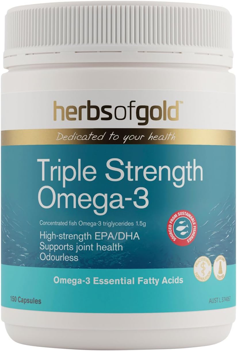 Herbs of Gold Triple Strength Omega-3 is a high-strength fish oil supplement rich in eicosapentaenoic acid (EPA) and docosahexaenoic acid (DHA).