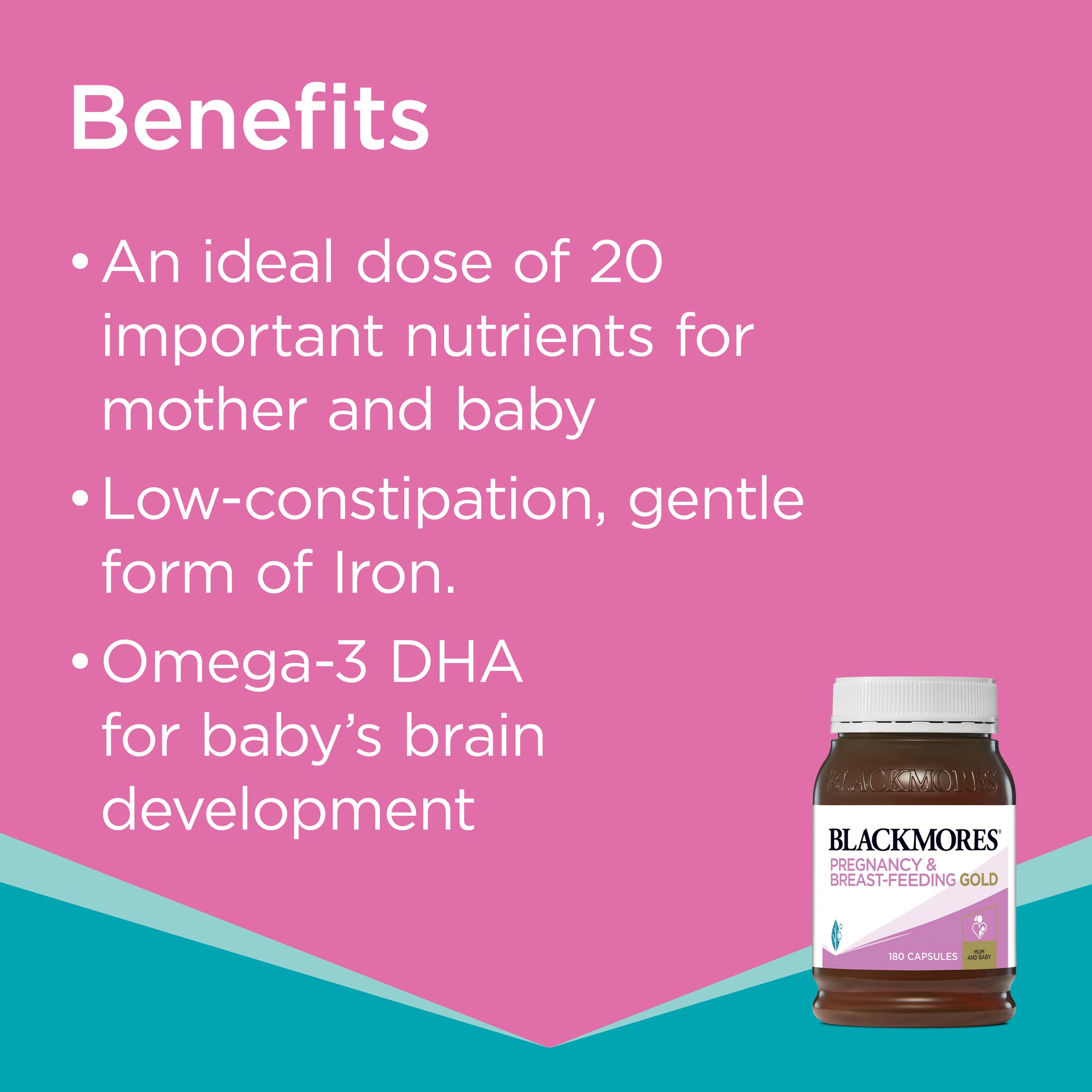 Blackmores Pregnancy & Breast-Feeding Gold provides 20 important nutrients in total including a daily dose of: